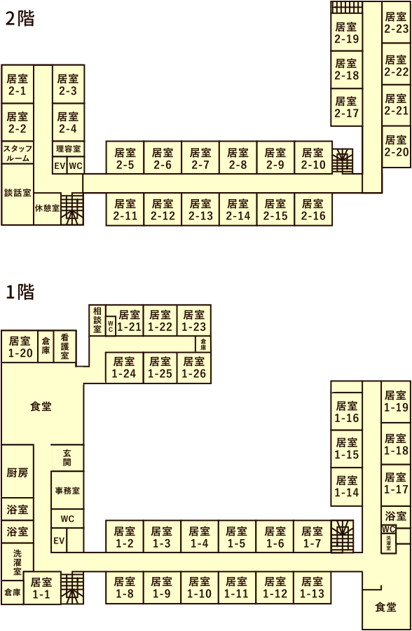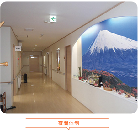 夜間は介護職員2名体制を取っております。入居者様の急変時には待機の施設職員がすぐに駆けつける体制をとっておりますので、夜間も日中同様、安心した生活を送って頂けます。